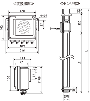 | ケーブル | 標準=7.5m×1本 (PVC被覆、標準径=Φ8.5mm、センサとの接続=コネクタ)